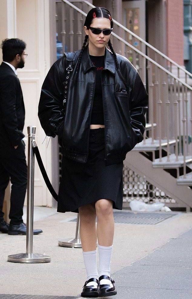 Офисные сирены – самые модные девчонки 2024 года. Они носят приталенные блузки, расстегнутые на несколько пуговиц, юбки-карандаши, облегающие черные водолазки, остроносые слингбэки и очки в стиле гик-шик. Последние обожают Белла Хадид, фэшн-инфлюенсер Gabriette, Doja Cat и многие другие приверженцы эстетики. Узкие очки в прямоугольной оправе практически без затемнения играют ключевую роль в образе – они добавляют нужный уровень строгости, которая граничит с сексуальностью. Кстати, если ты все же хочешь, чтобы аксессуар защищал глаза от солнца, выбирай светло-коричневые линзы.