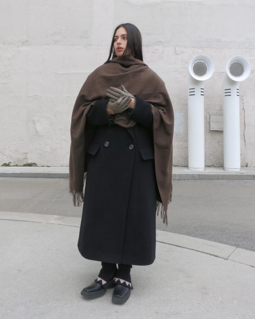 Грядущей зимой пальто будет модно носить не совсем обычным способом. Дизайнерский цех в компании с фэшн-инфлюенсерами предлагают стилизовать пальто с широким шарфом, закинув его концы назад. Получается небанальный, но в то же время очень теплый и завершенный образ.
