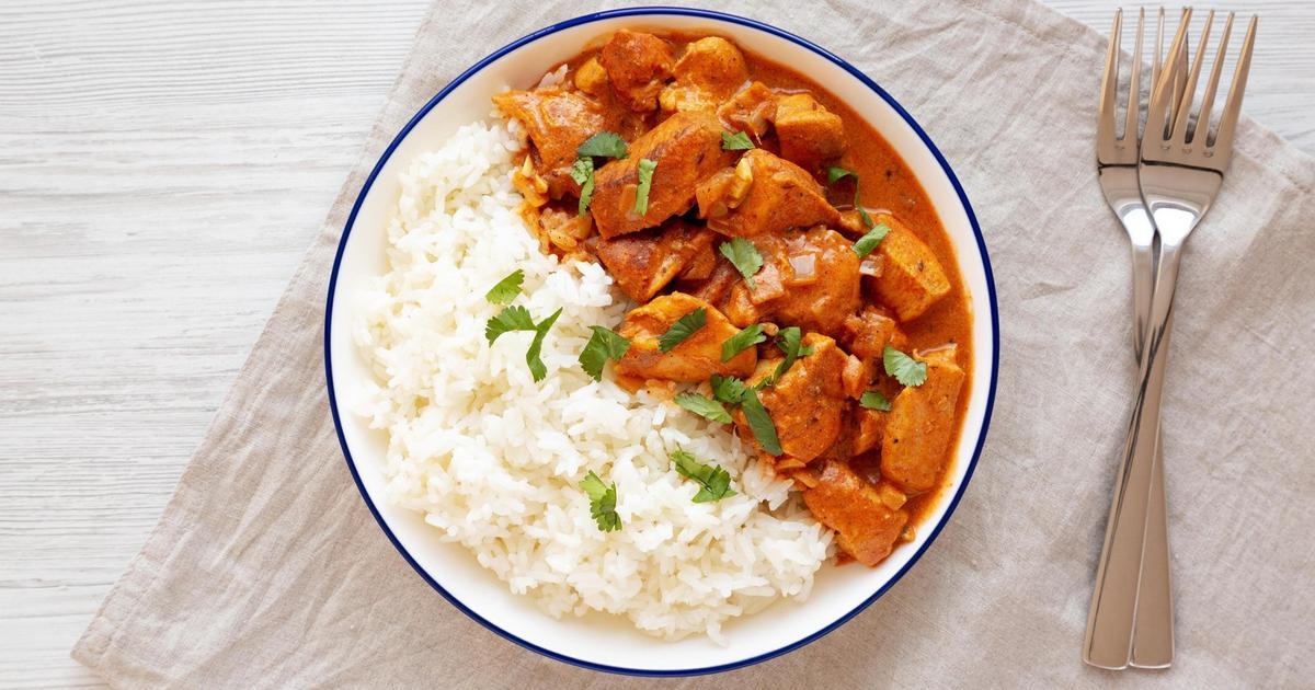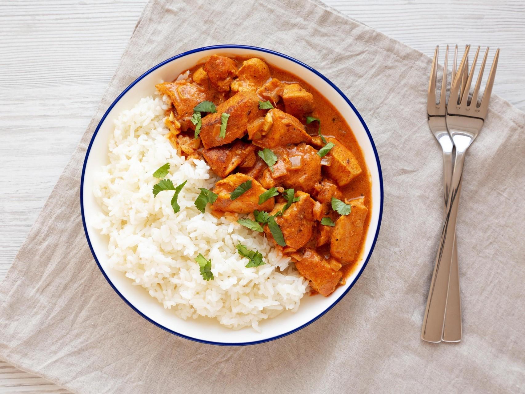 Очищенный лук нарежьте на небольшие кусочки, а имбирь и чеснок — мелкими кубиками. Выложите все три ингридиента в форму для запекания и добавьте к ним гарам масалу, карри-порошок, манговый чатни, нарезанные помидоры, кокосовое молоко и томатное пюре (его по желанию, но для мягкости вкуса лучше положить). Тщательно перемешайте ложкой, выложите в форму нарезанную на кубики куриную грудку и еще раз перемешайте. Запекайте в духовке полчаса. Помешать за это время можно один раз.