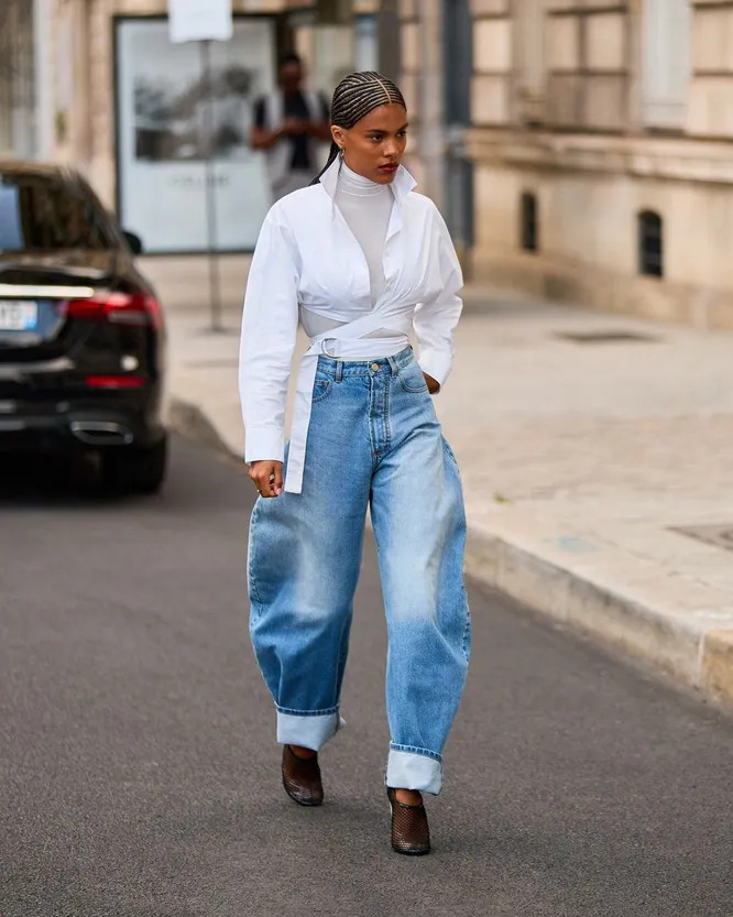 «Подкова» — еще один трендовый джинсовый силуэт этого года. Отличительная черта этой модели — изогнутая широкая штанина и слегка зауженный низ. И да, такие джинсы очень капризные. Во-первых, они должны быть сделать из очень плотного материала, чтобы удержать правильную форму «подкову», а во-вторых, при стилизации стоит учитывать, что джинсы О-силуэта могут полнить. Чтобы этого не случилось, верх должен быть облегающим.