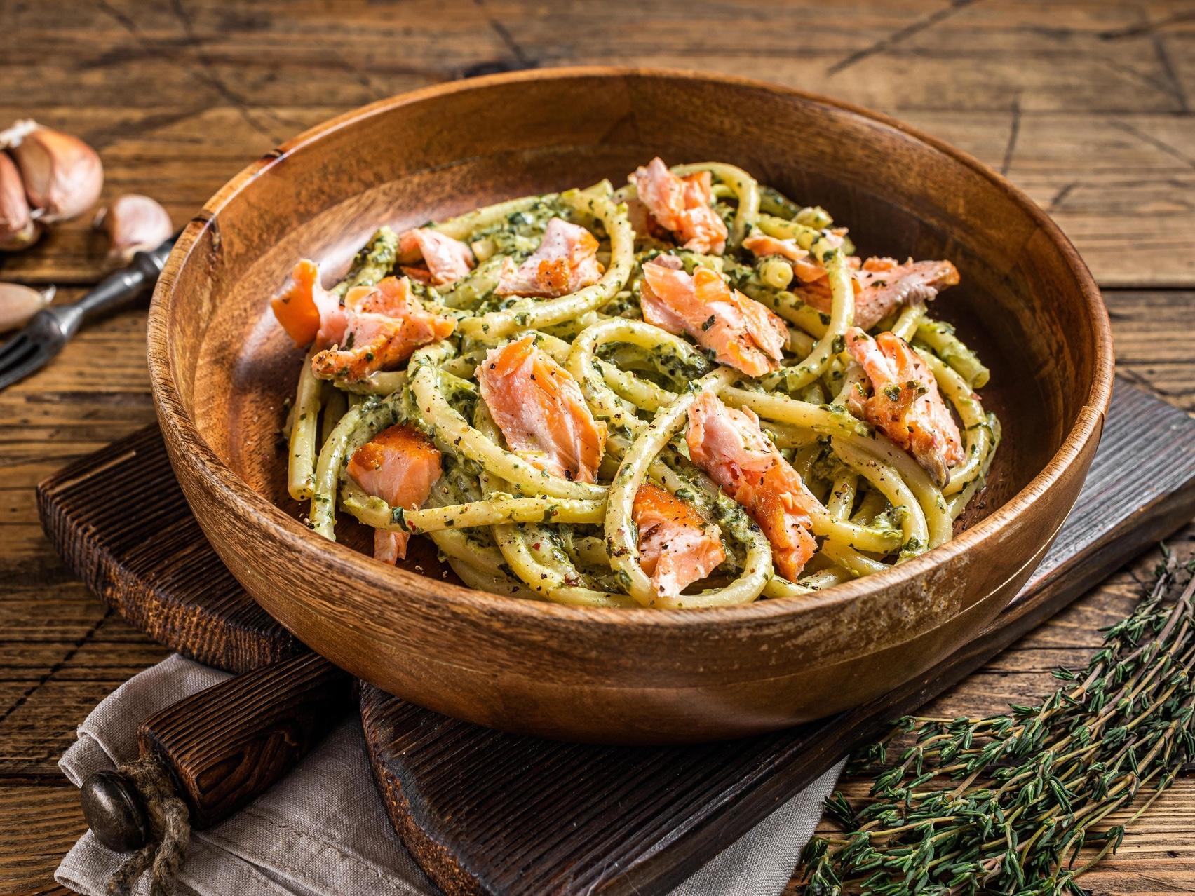 Хотя паста с лососем и выглядит очень изысканно, приготовить это блюдо быстро и просто. А еще, оно очень полезно: лосось содержит жиры Омега-3, которые замедляют старение, укрепляют ногти и поддерживают блеск волос. Кроме того, в пасте есть шпинат: кладезь железа и калия, который полезен людям с проблемами мочеиспускательной системы. Итак, вооружаемся глубокой сковородой и приступаем к готовке!