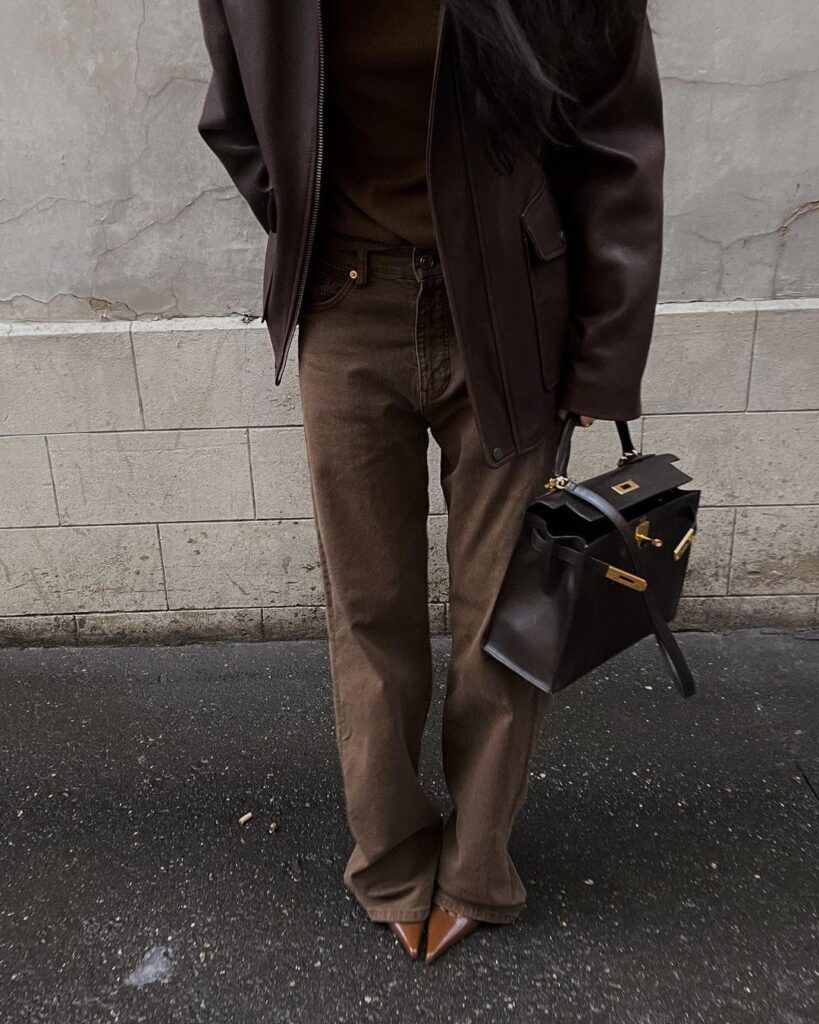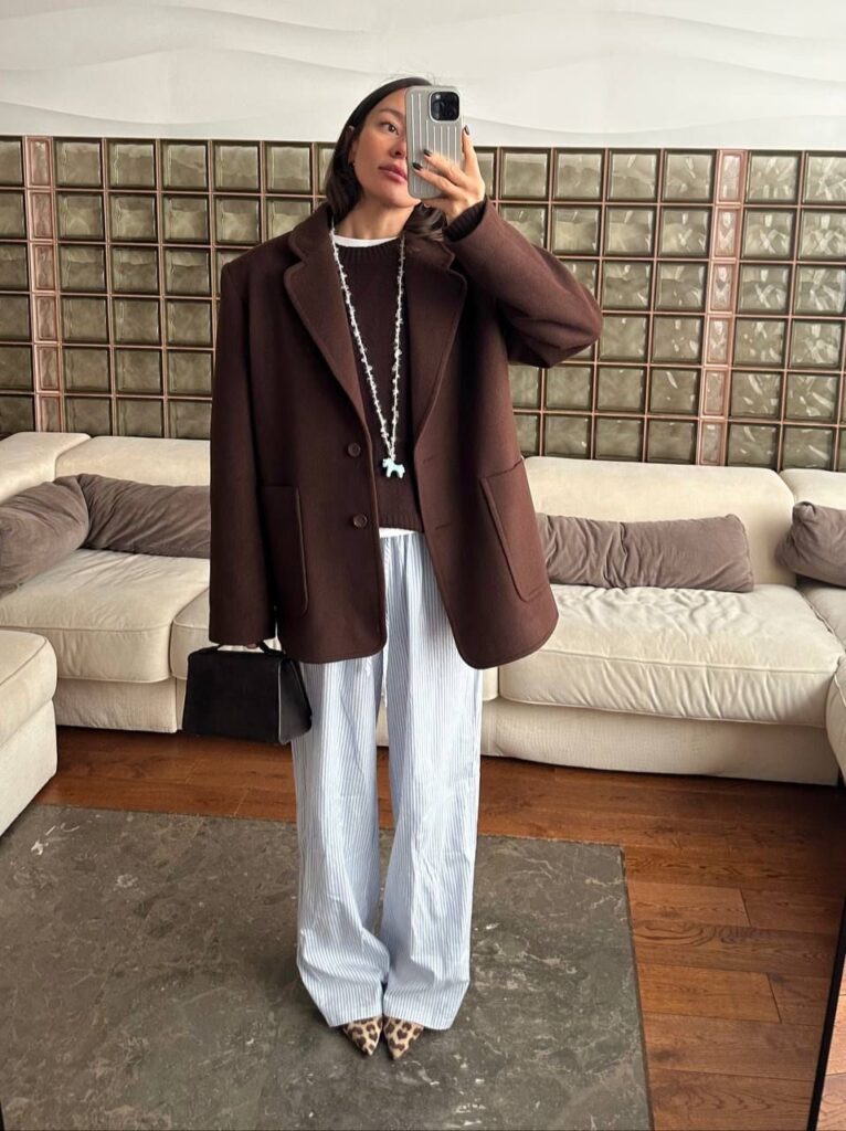 Оттенки коричневого – самая настоящая база осеннего сезона. Они идеально мэтчатся с настроением времени года, очень дорого выглядят и выигрышно сочетаются с бежевым, черным, голубым и бледно-розовым. Что касается конкретных айтемов, лучше всего выбирать шоколадные брючные костюмы, пальто, куртки и шерстяные юбки.