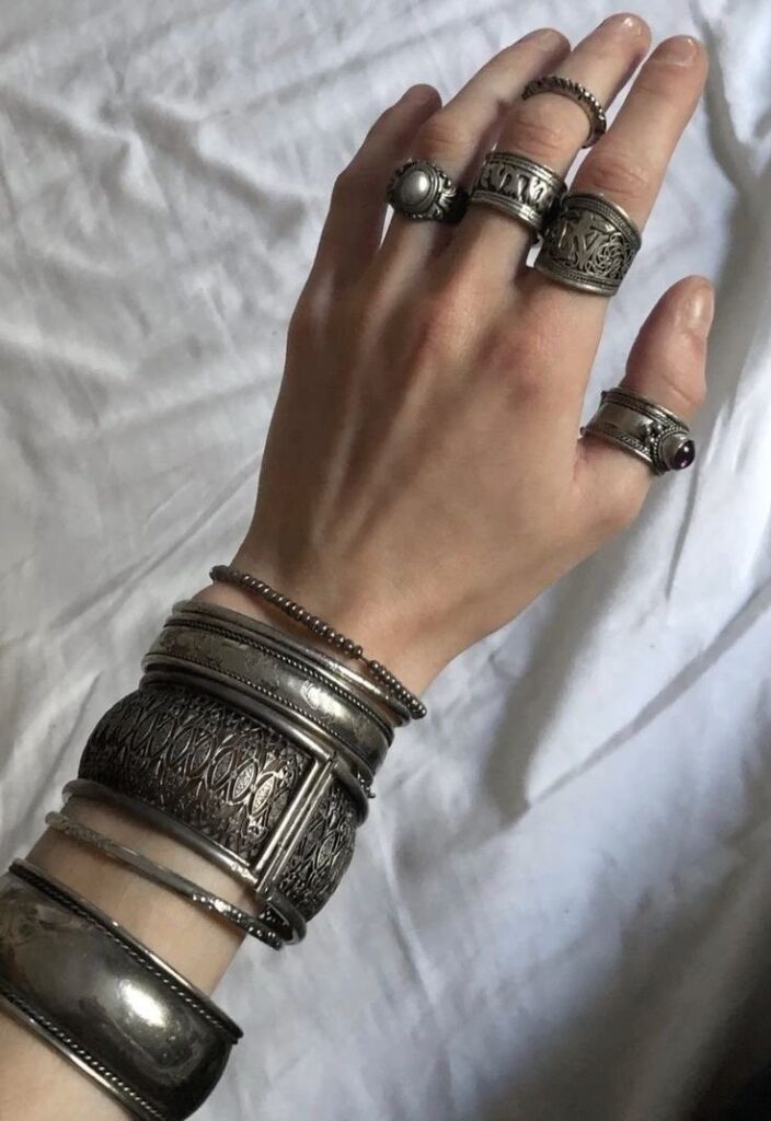 Черненое серебро – это серебро, поверхность которого искусственно затемнили с помощью специального состава, чтобы создать контраст, сделать украшение более объемным и подчеркнуть рельеф, узор или гравировку. Так вот украшения из металла с такой обработкой были популярны в СССР в 1970-х и 1980-х годах. Сегодня они вновь возвращаются на фэшн-арену: кто-то находит трендовые кольца и серьги в шкатулке бабушки, а кто-то ищет «сокровище» в винтажках. Кстати, многие бренды сейчас переосмысляют украшения из черненого серебра и создают нечто совершенно иное.
