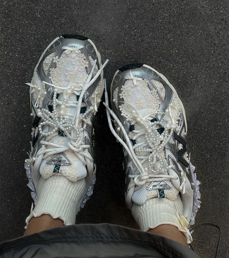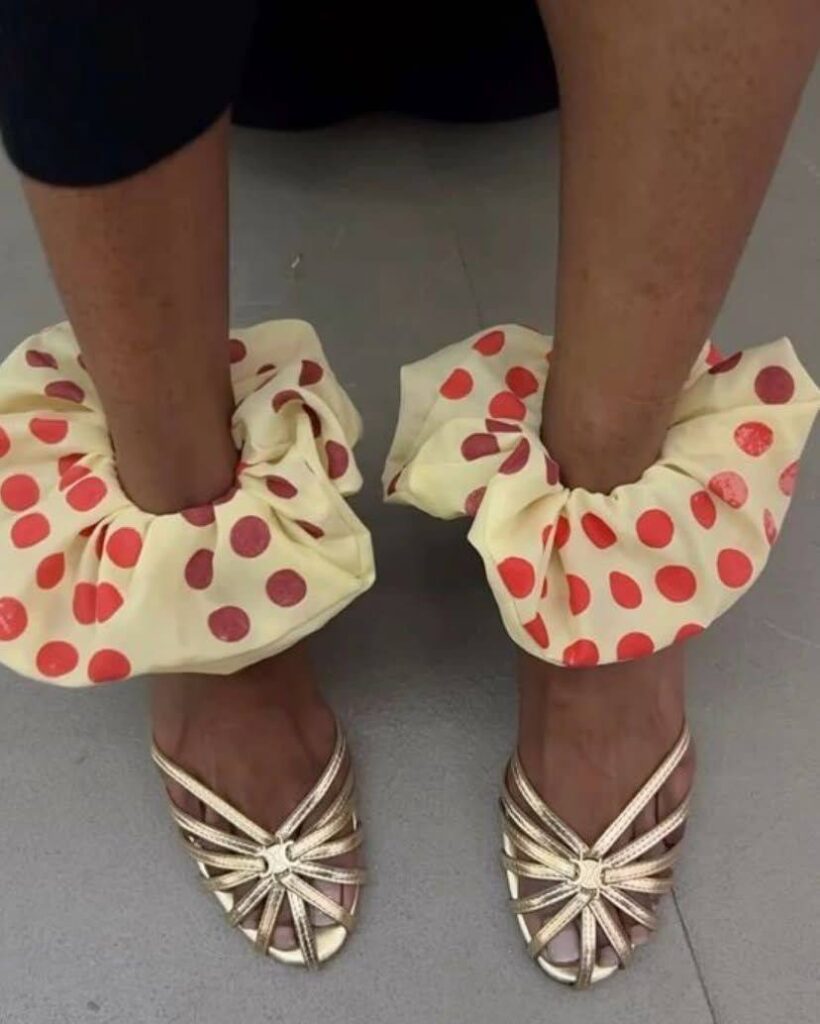 Да, ты не ослышалась. Теперь атласные резинки можно смело носить в качестве анклета. Лучше всего аксессуар смотрится с нарочито инфантильными луками в духе Айрис Лоу или Лары Виолетты. Но даже если ты предпочитаешь минимализм, белая атласная резинка отлично впишется в образ и станет неожиданным акцентом.